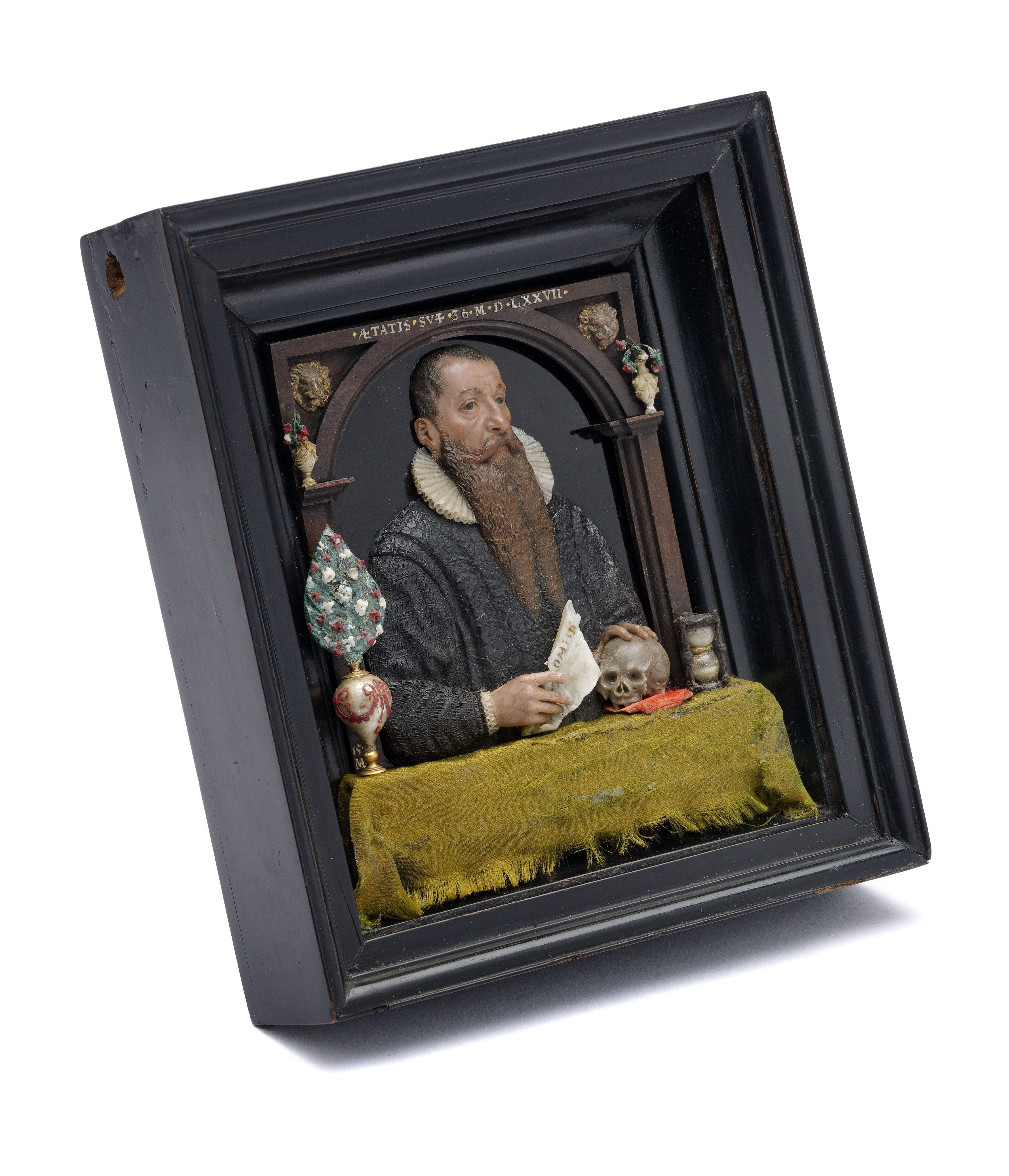 Wax on glass plate; fabric; sheet copper; original frame with sliding cover: ebonised cherry and pearwood