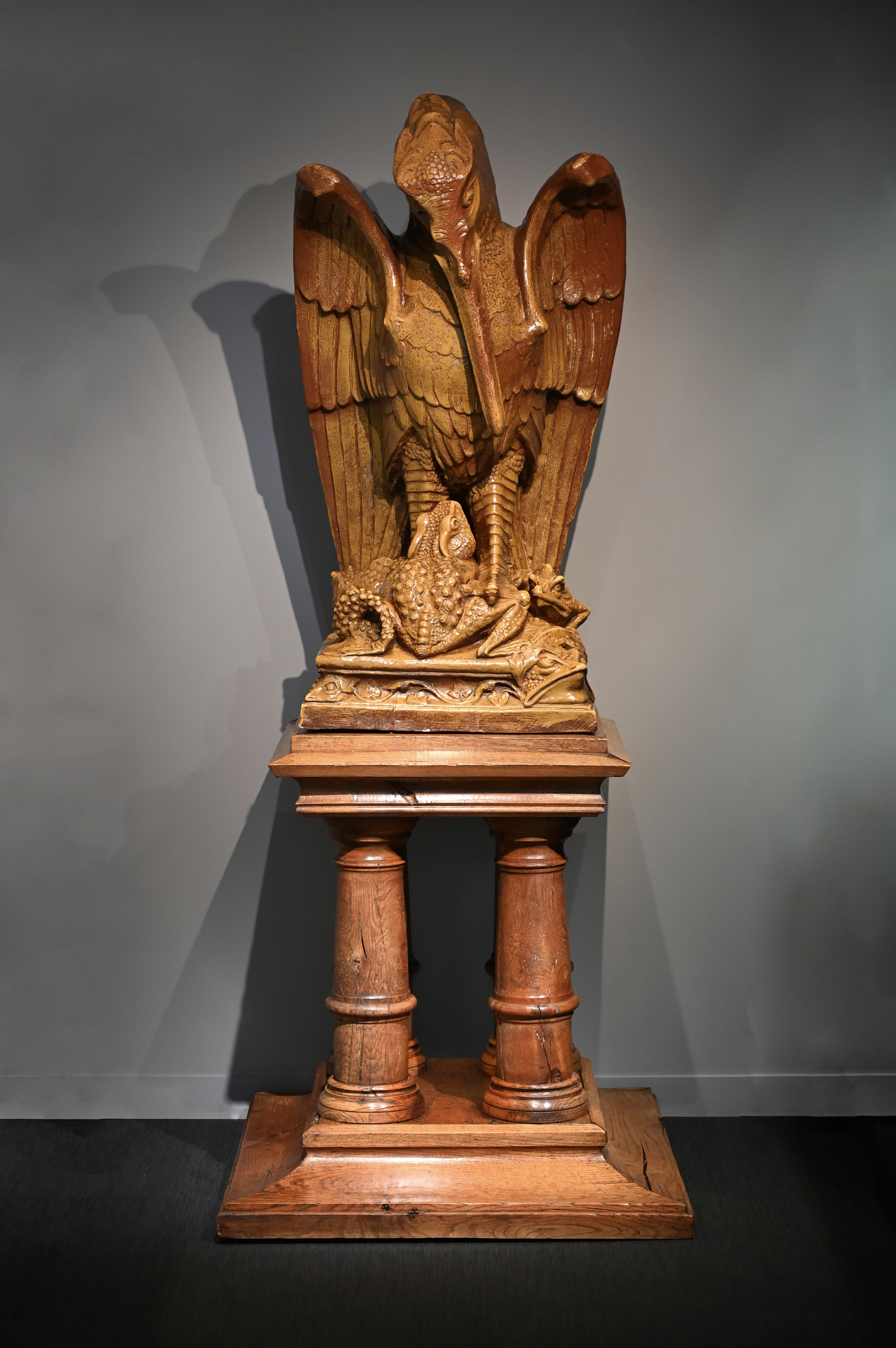Stoneware with black, grey; red-brown and green enamels