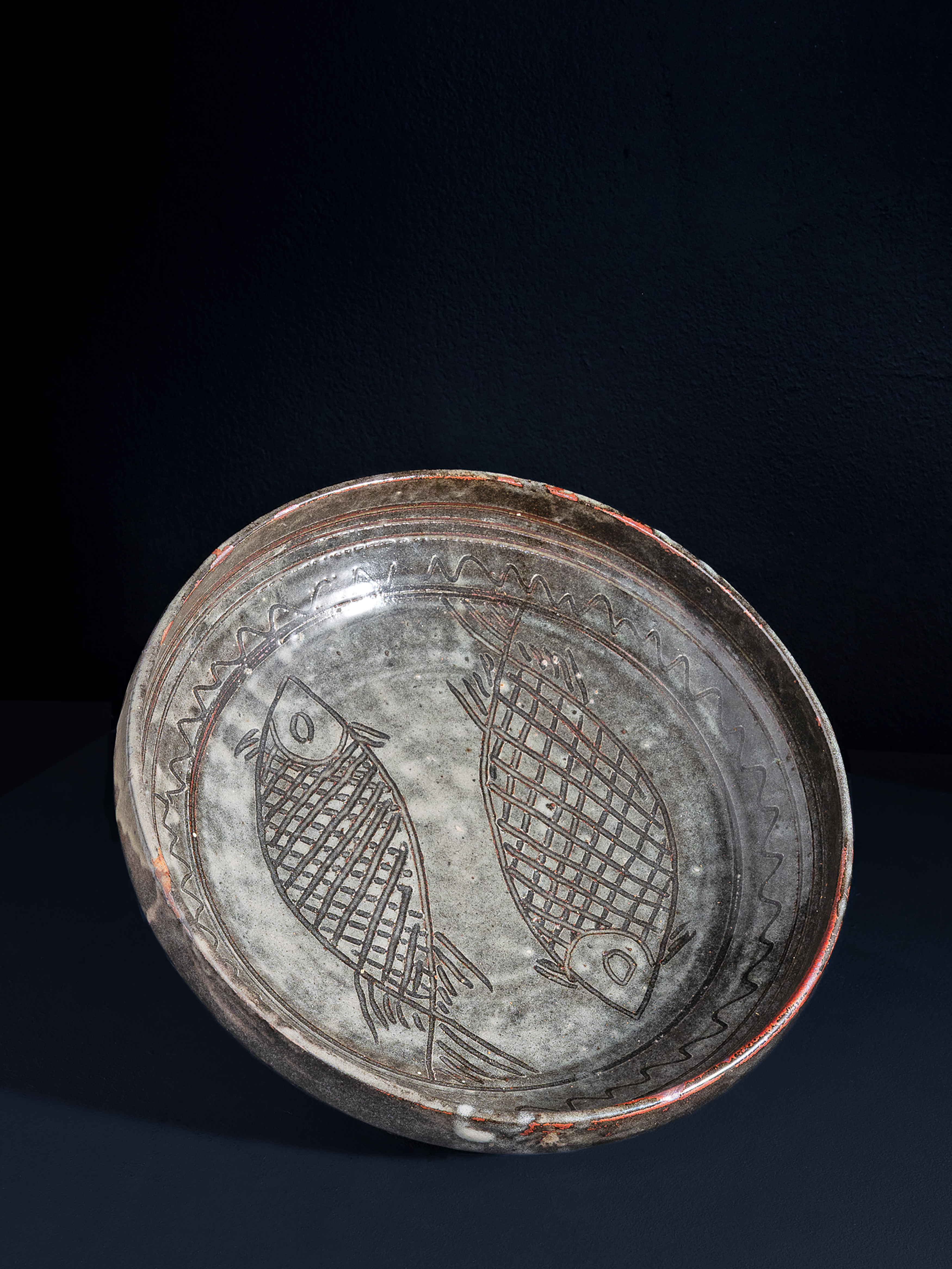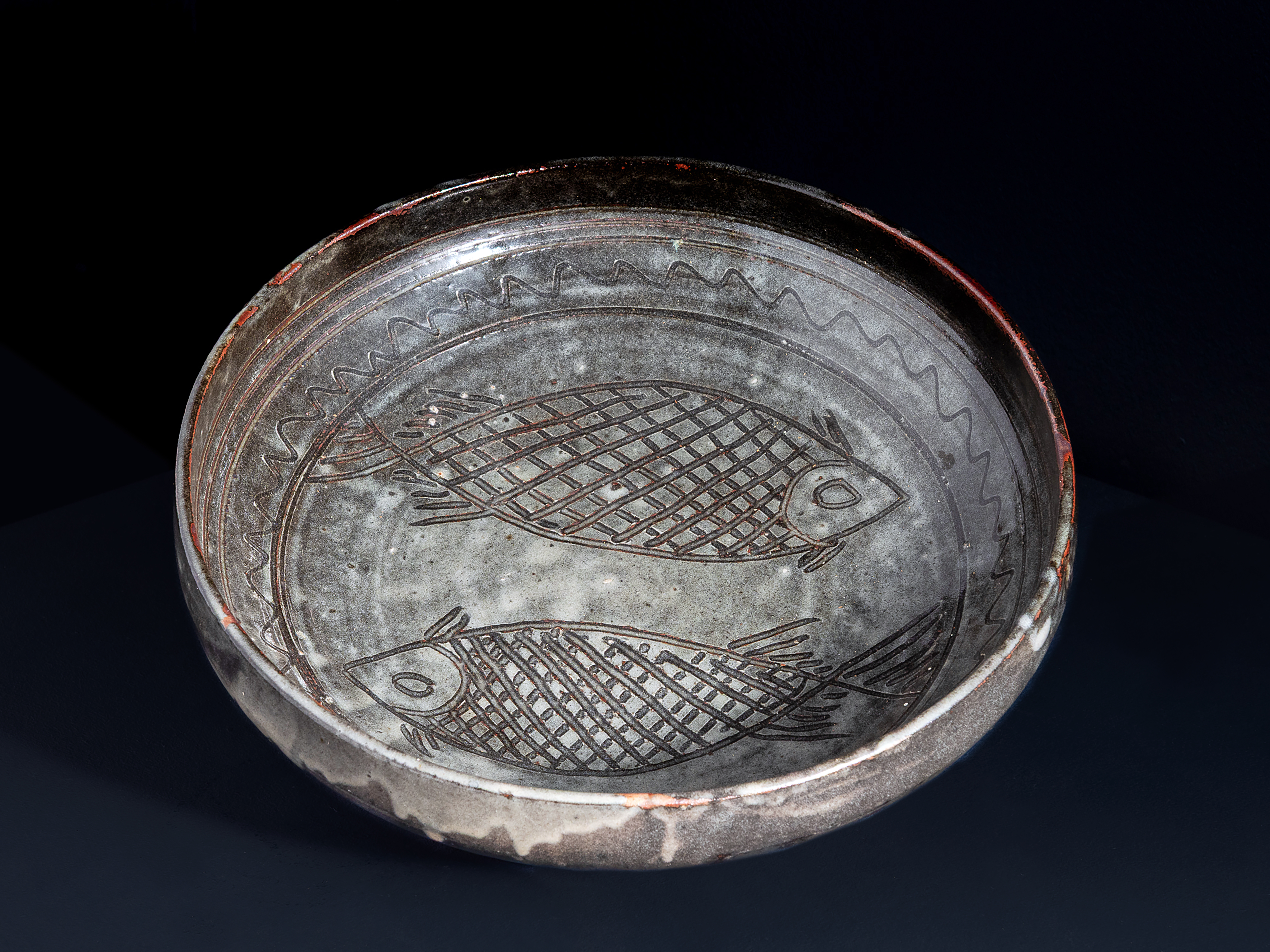 Stoneware, grey, transparent and Iron glazing with incised fish motif in the well, impressed LK and Abuja pottery seals