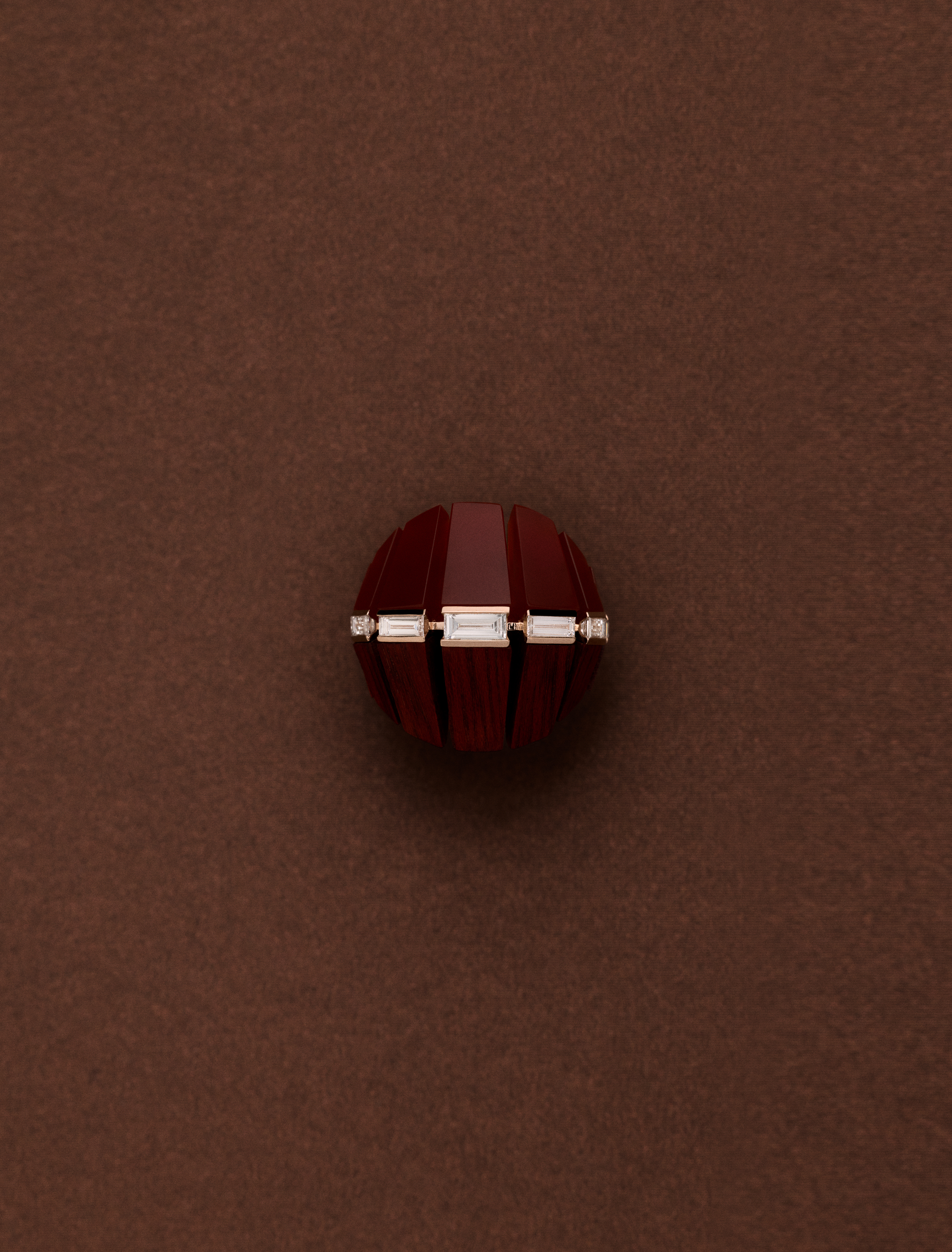 18k yellow gold, diamond, ebony, jasper, onyx, mother of pearl, opal, carnelian, bloodwood.
