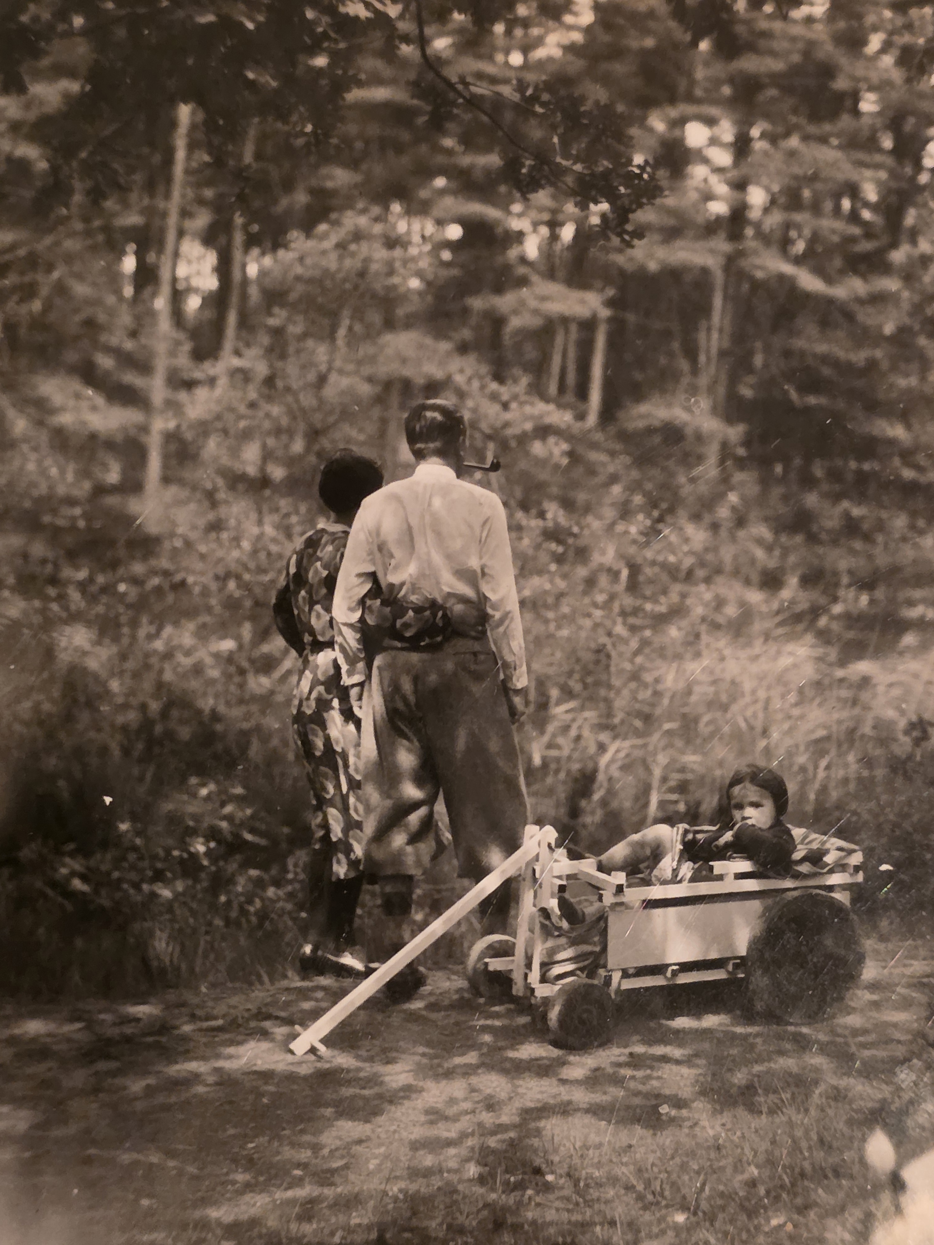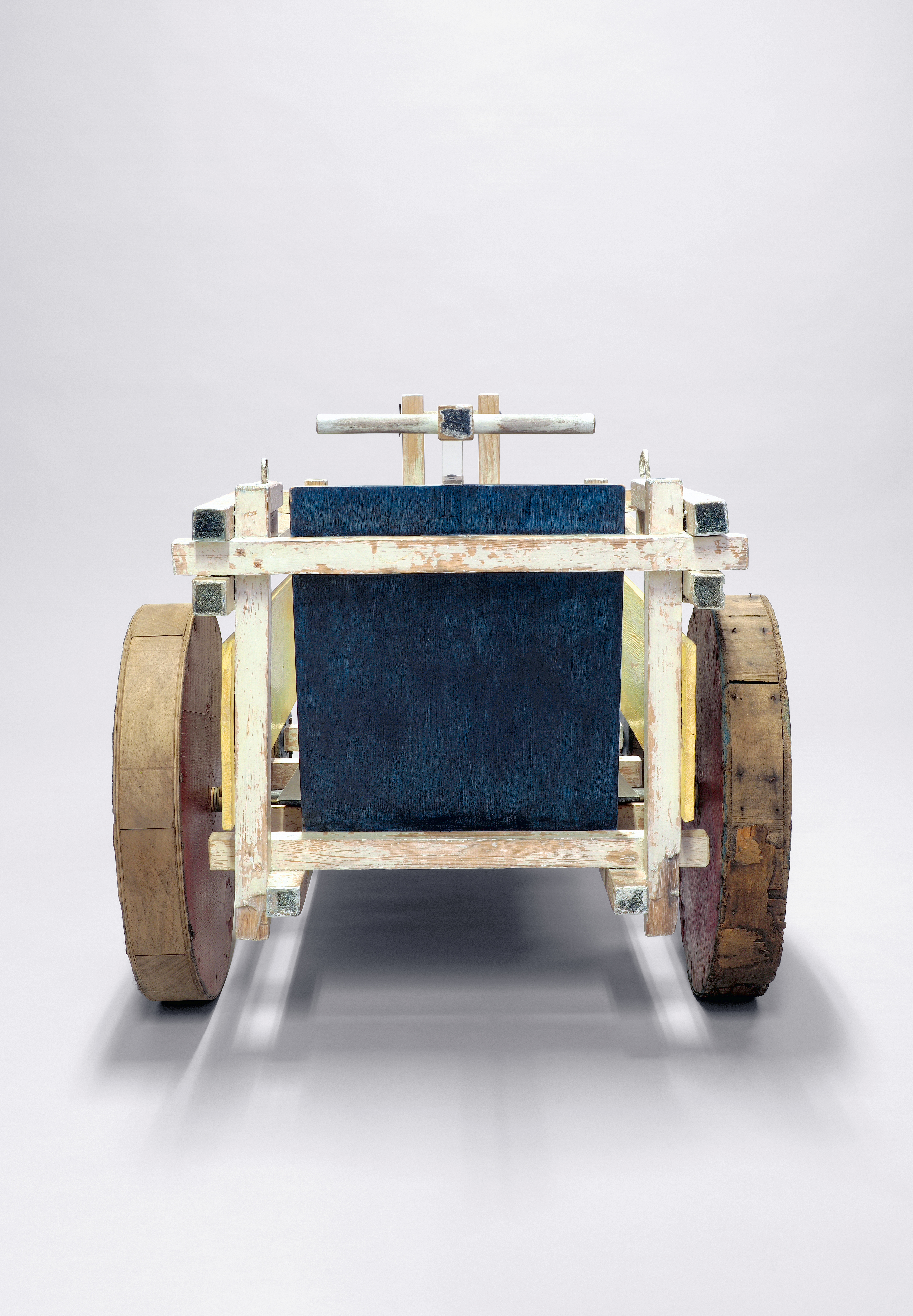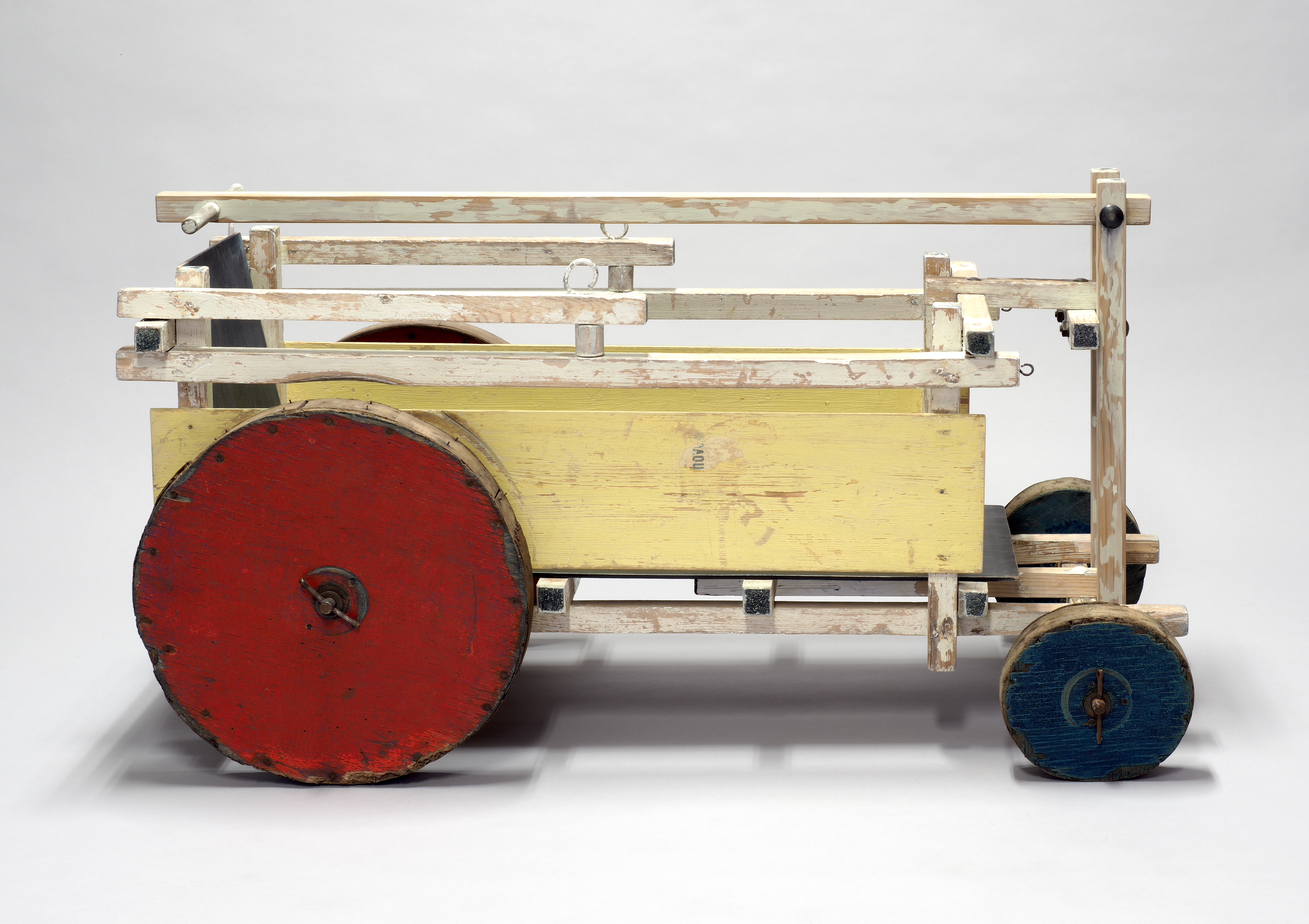 Framework of pine wood slats supporting a plywood seating and backrest, with wheels made of wood and plywood connected to the frame with axes of solid steel. Painted red, yellow, blue, black and white.