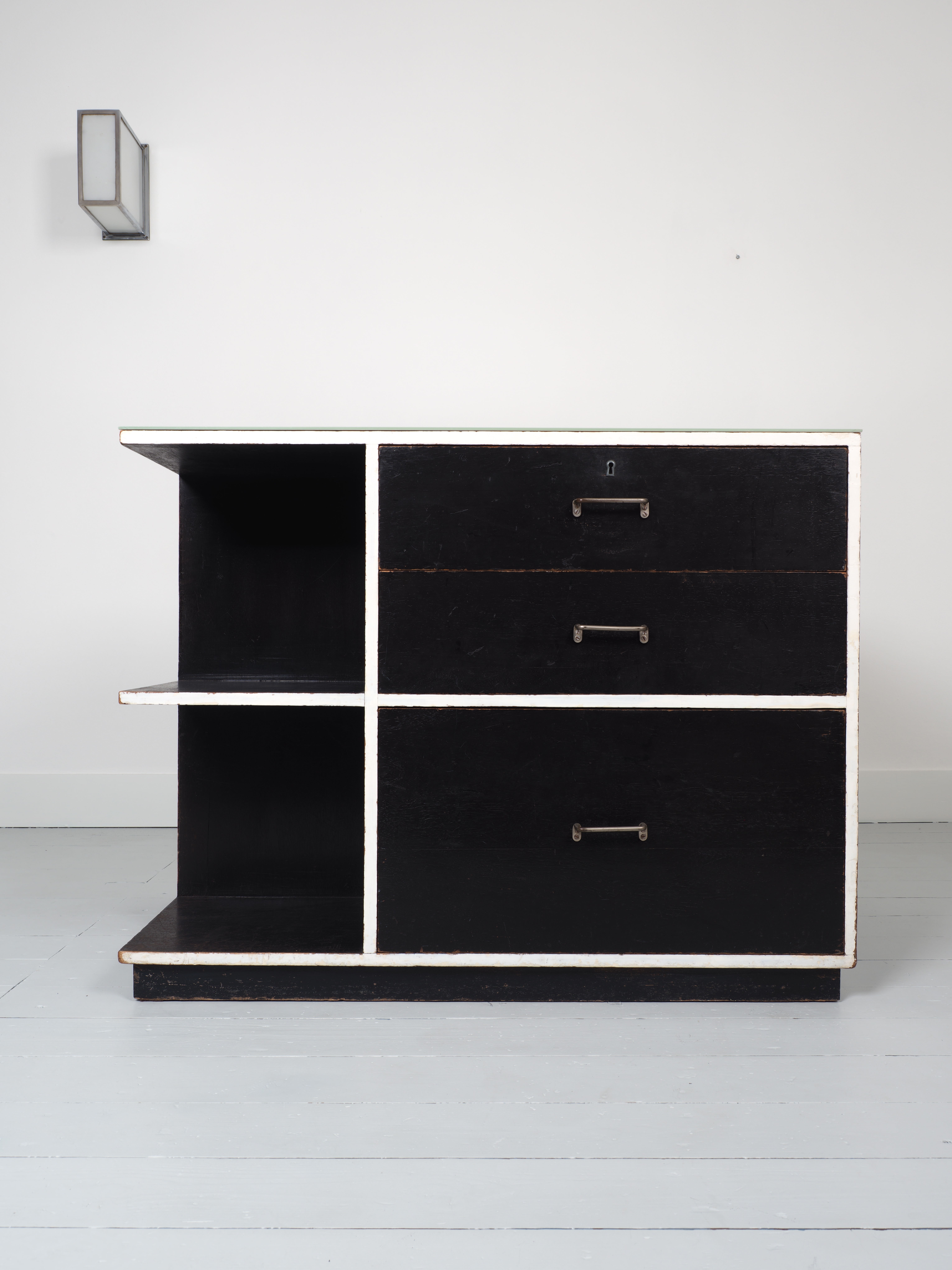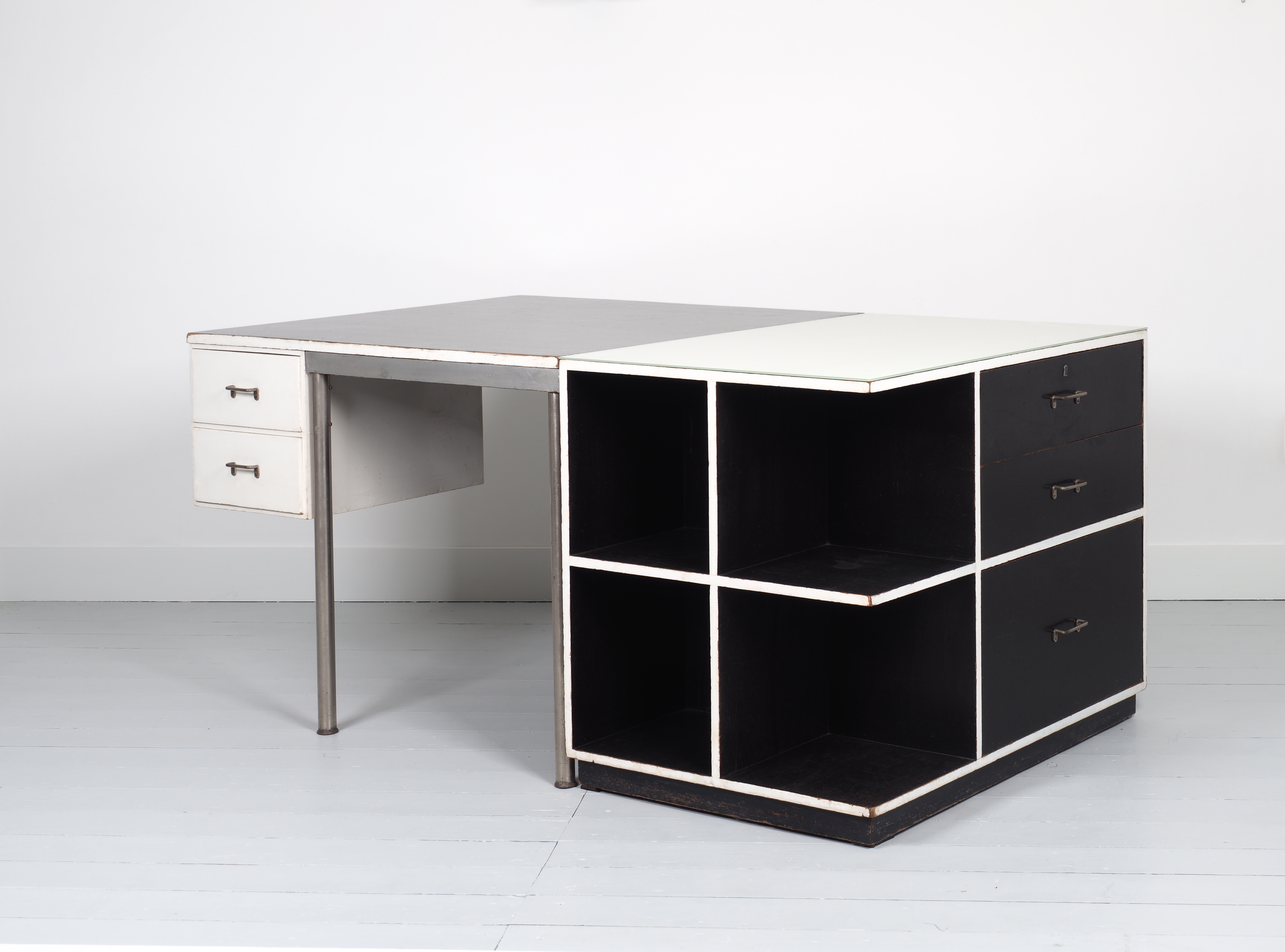 On the left: A black lacquered wooden top with a white lacquered wooden drawer unit on a silver-painted metal frame with nickel-plated tubular steel legs. On the right: A black-stained wooden cabinet with white edges and a glass top.