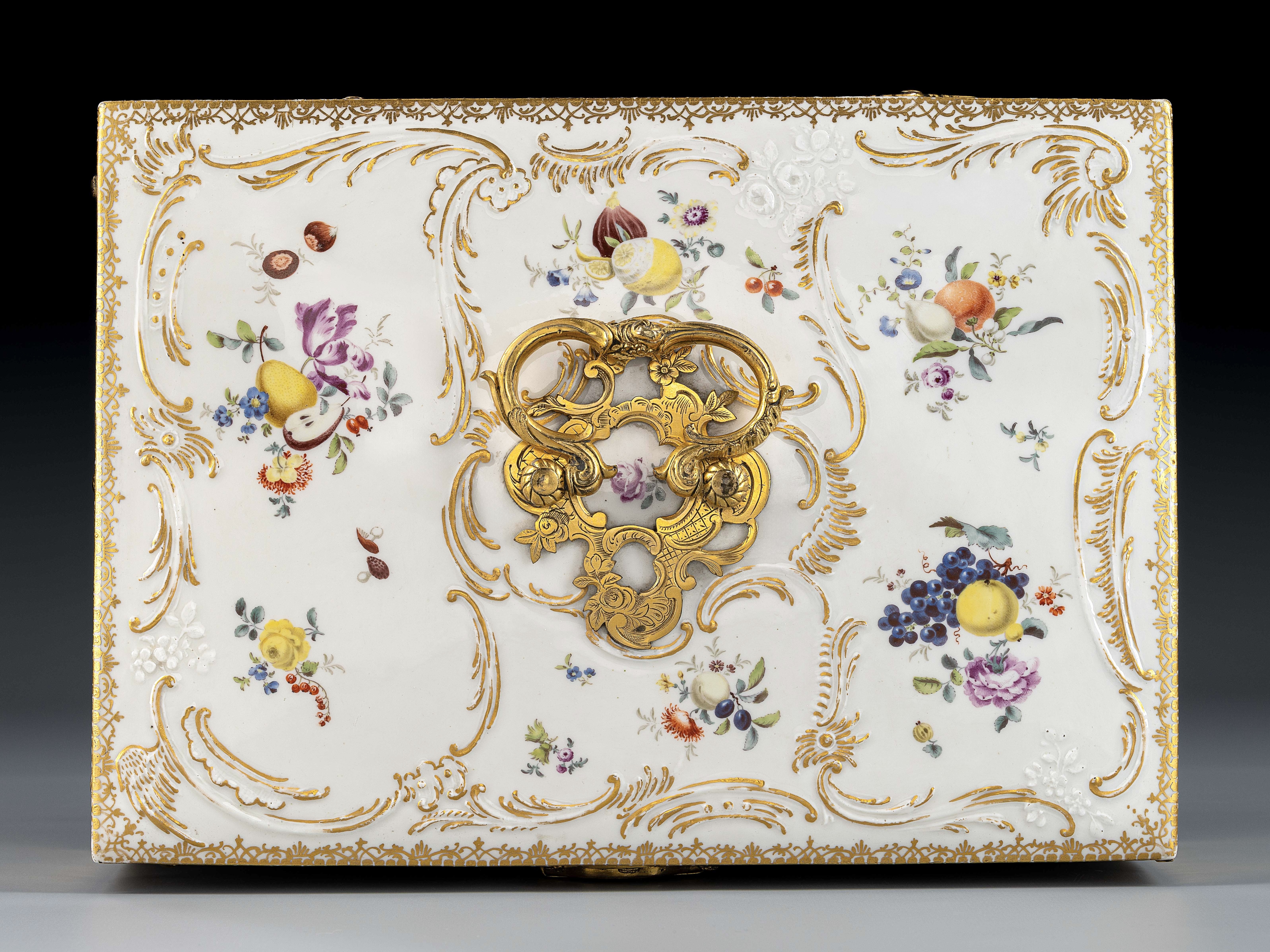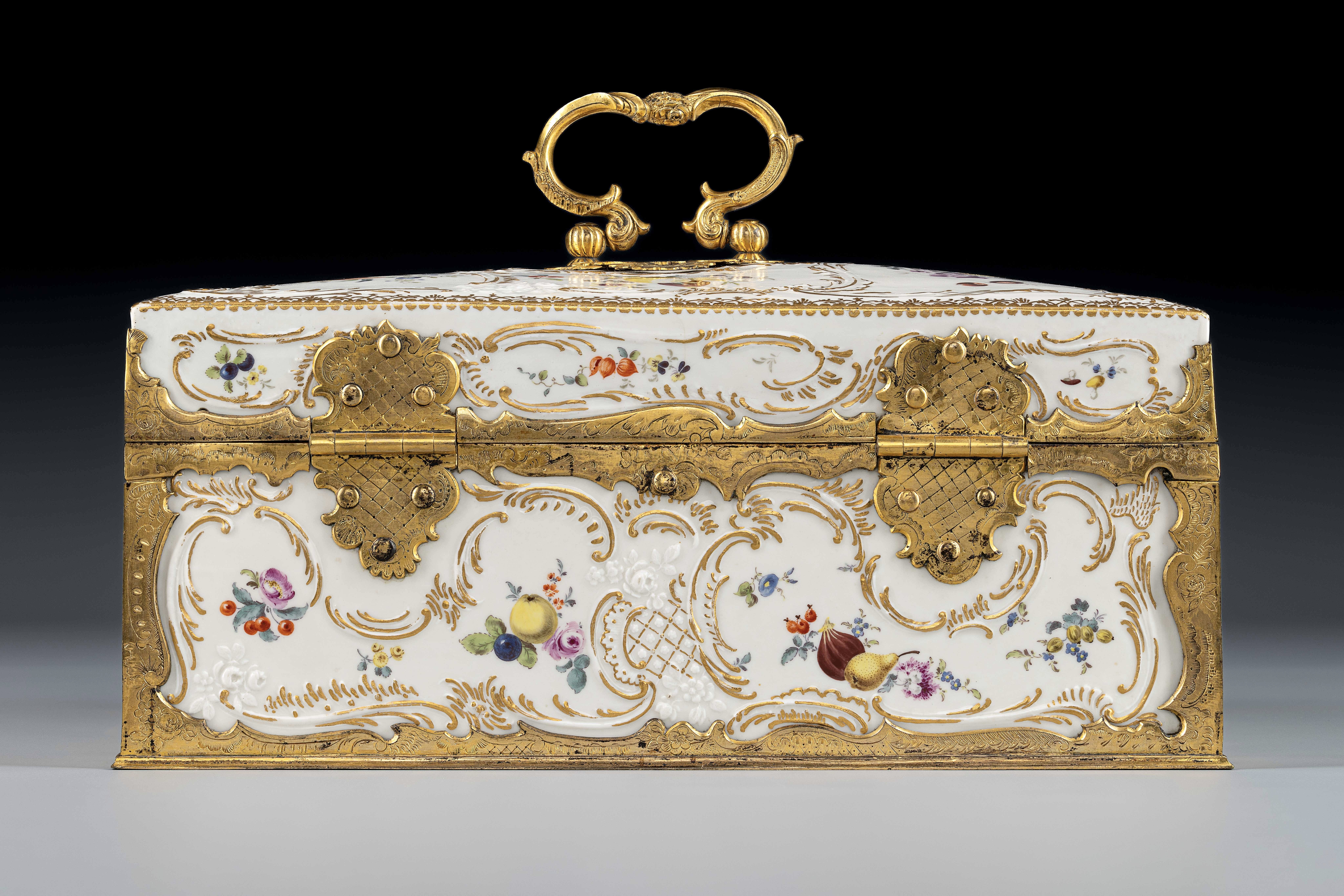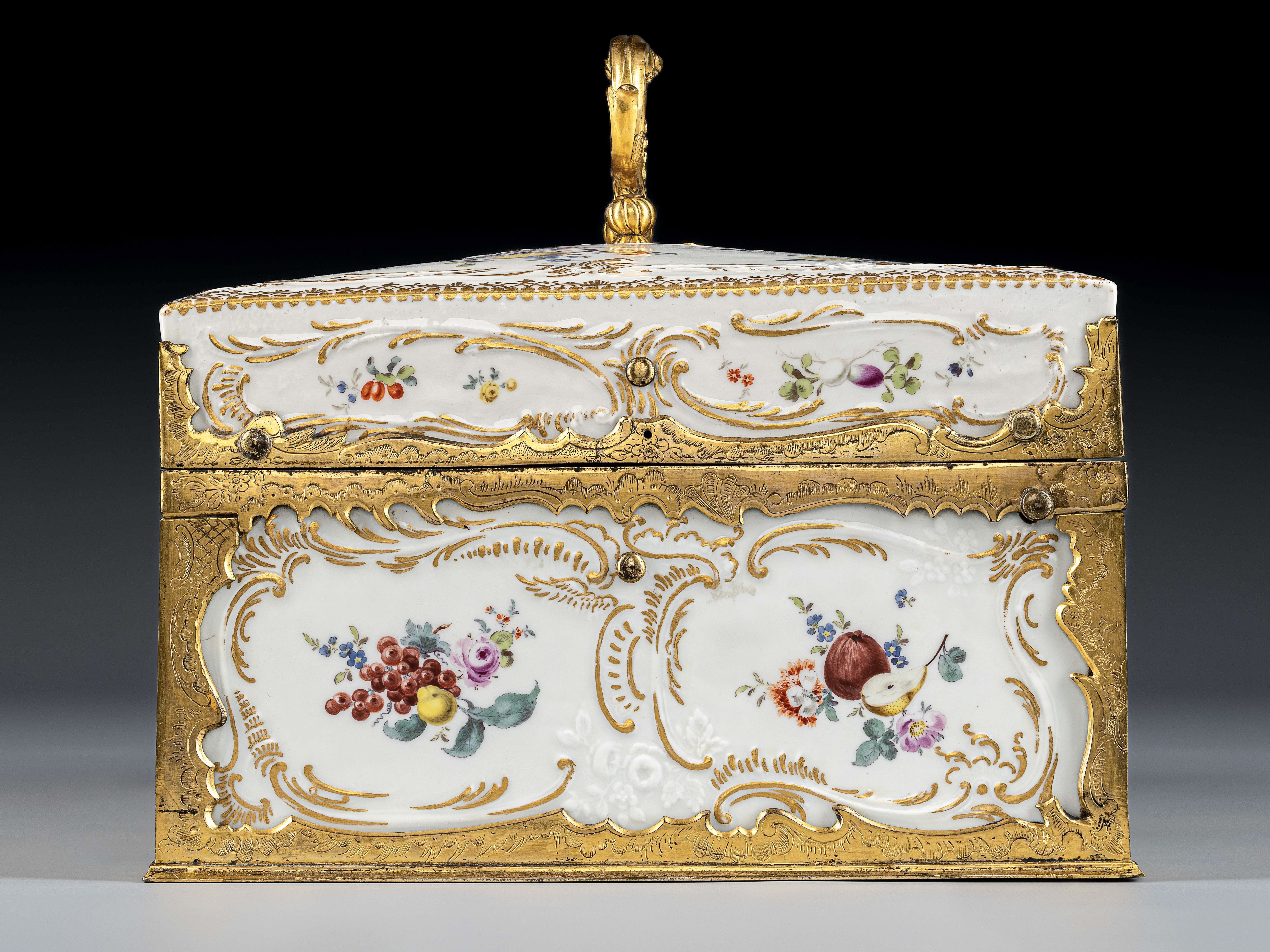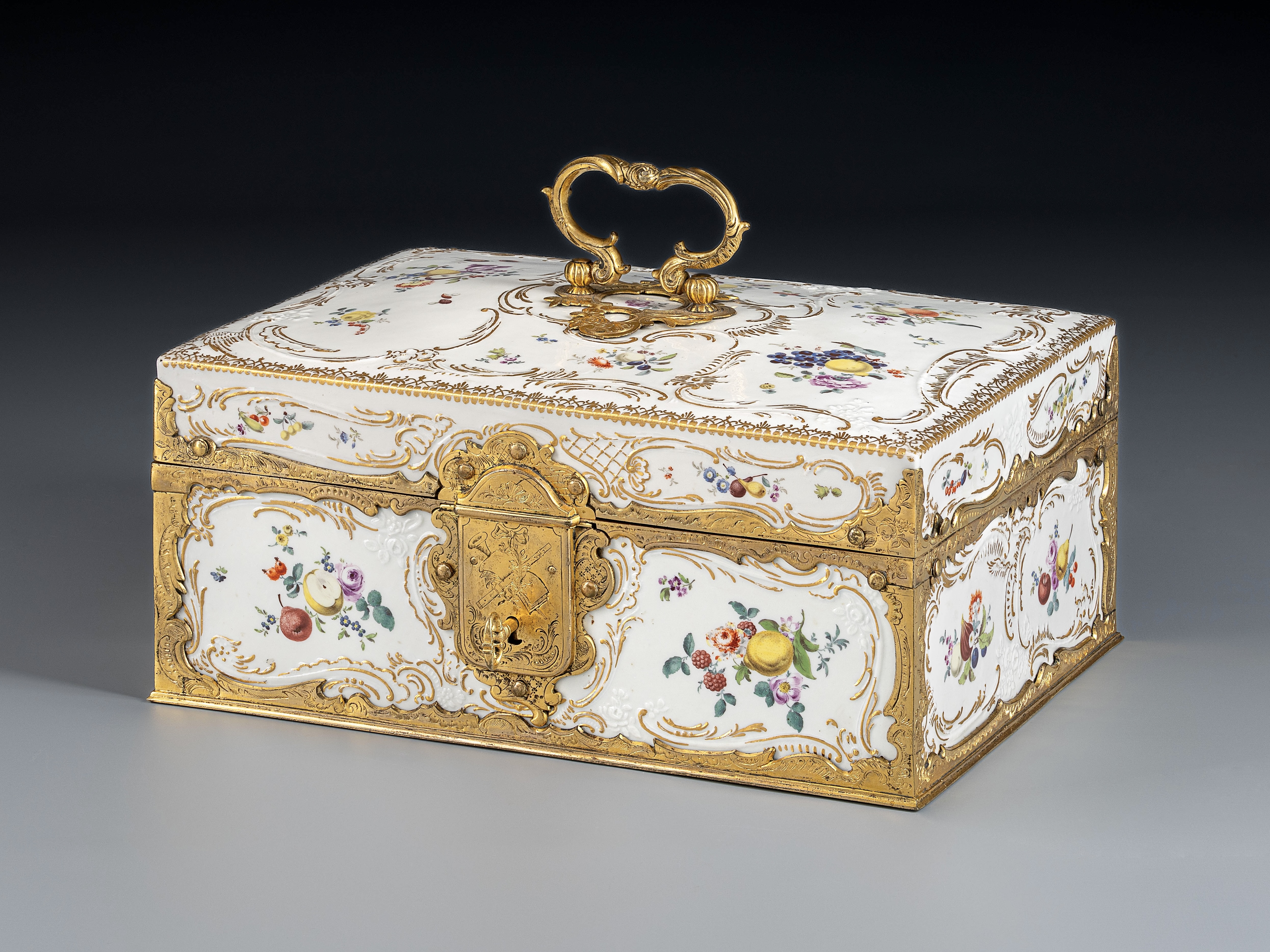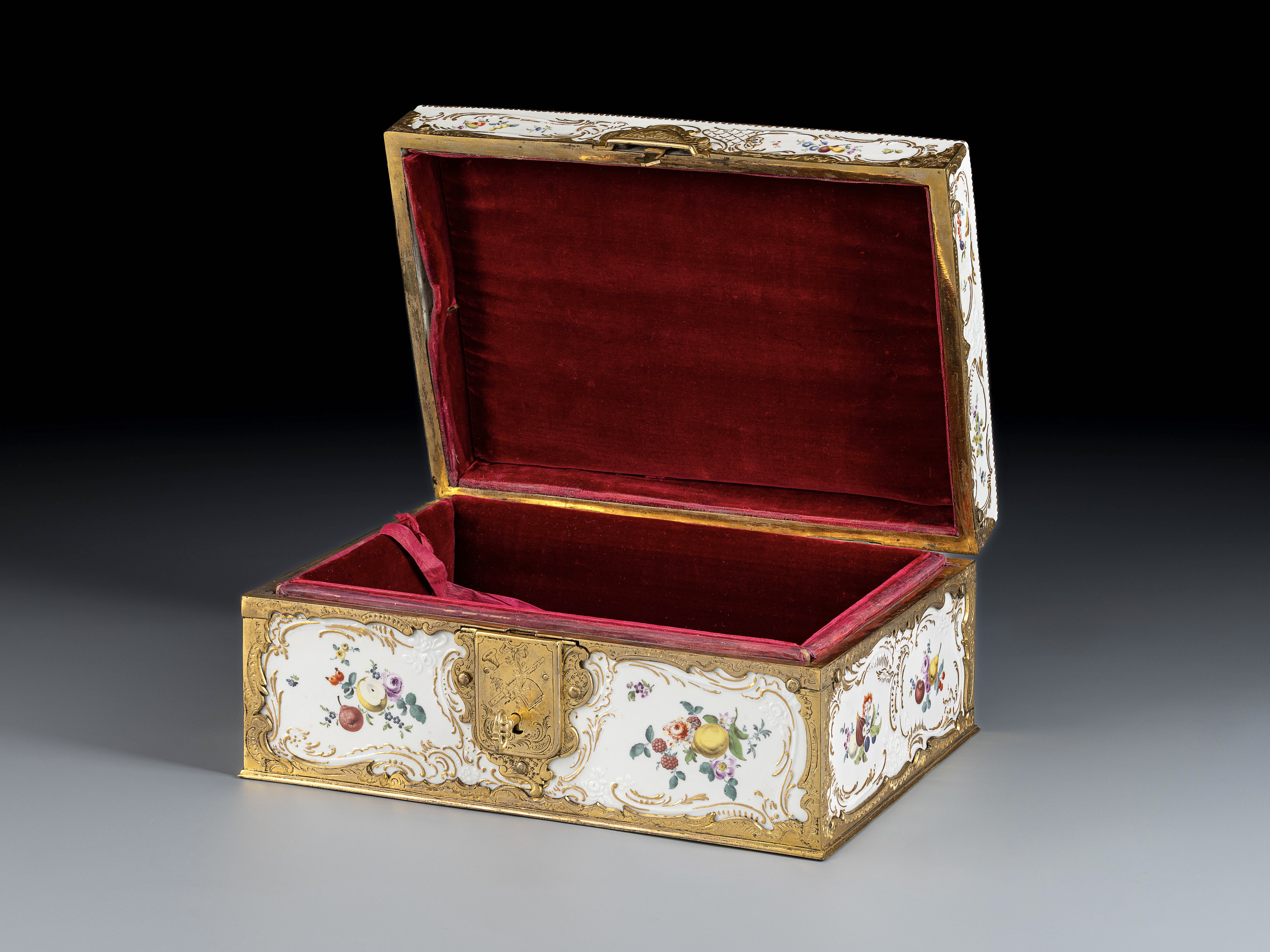 Hard-paste porcelain with polychrome and gold decoration; gilt brass, engraved; wood; red silk and velvet lining (replaced)