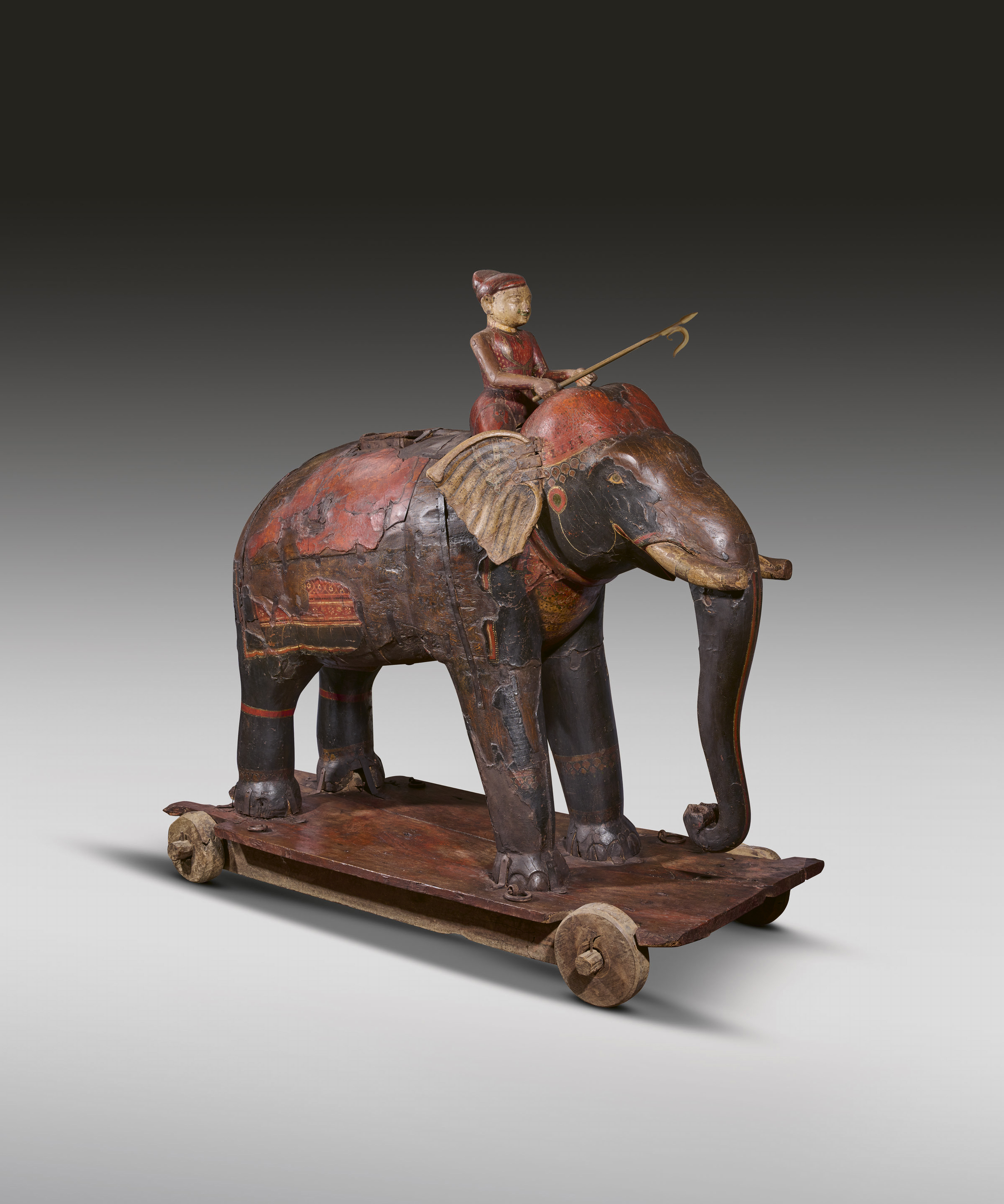 Carved and painted wooden automaton in the form of a near life size elephant being ridden by a prince. The elephant stands on a trolley with four wheels.
