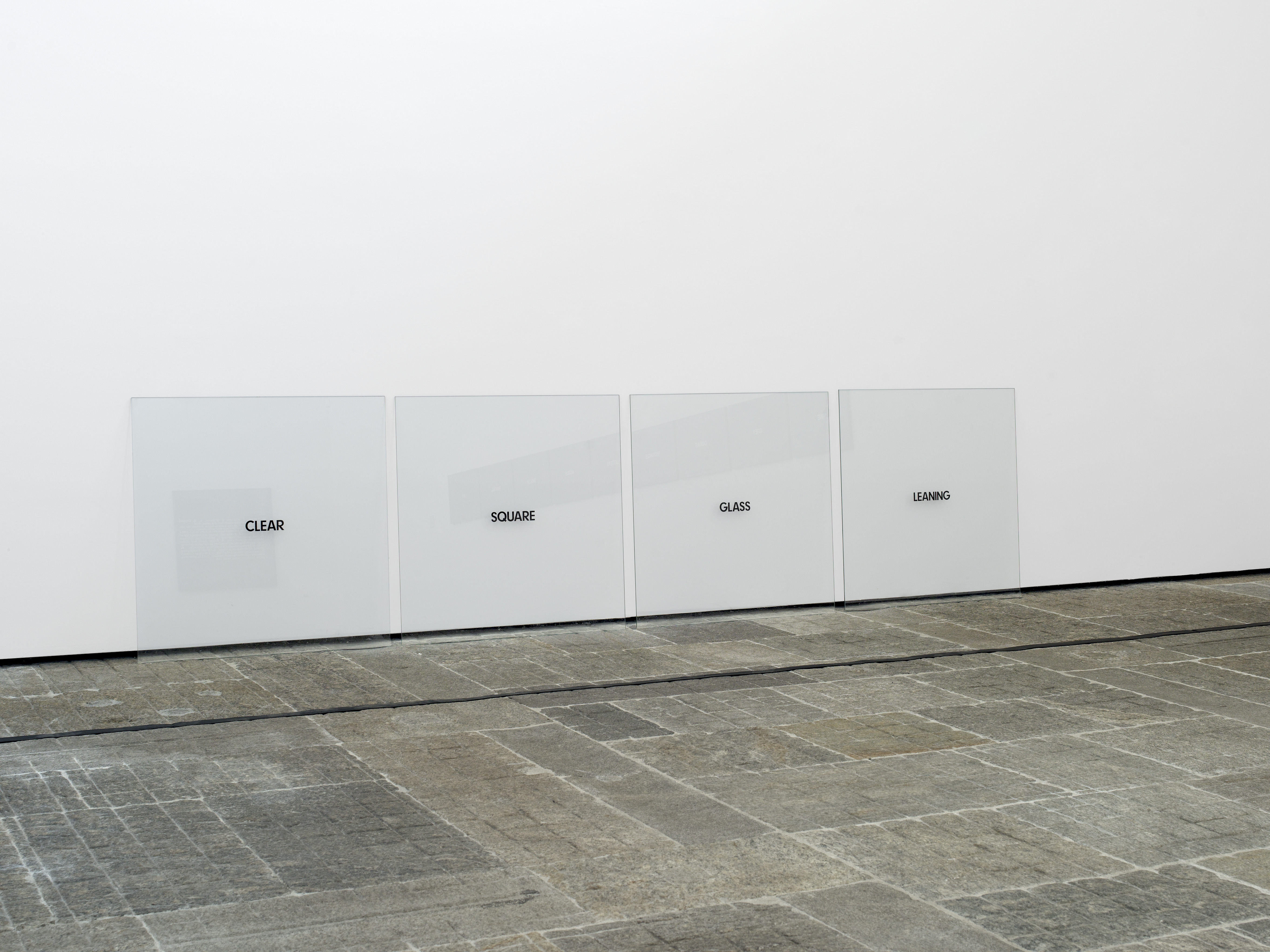 4 square glass plates, black lettering