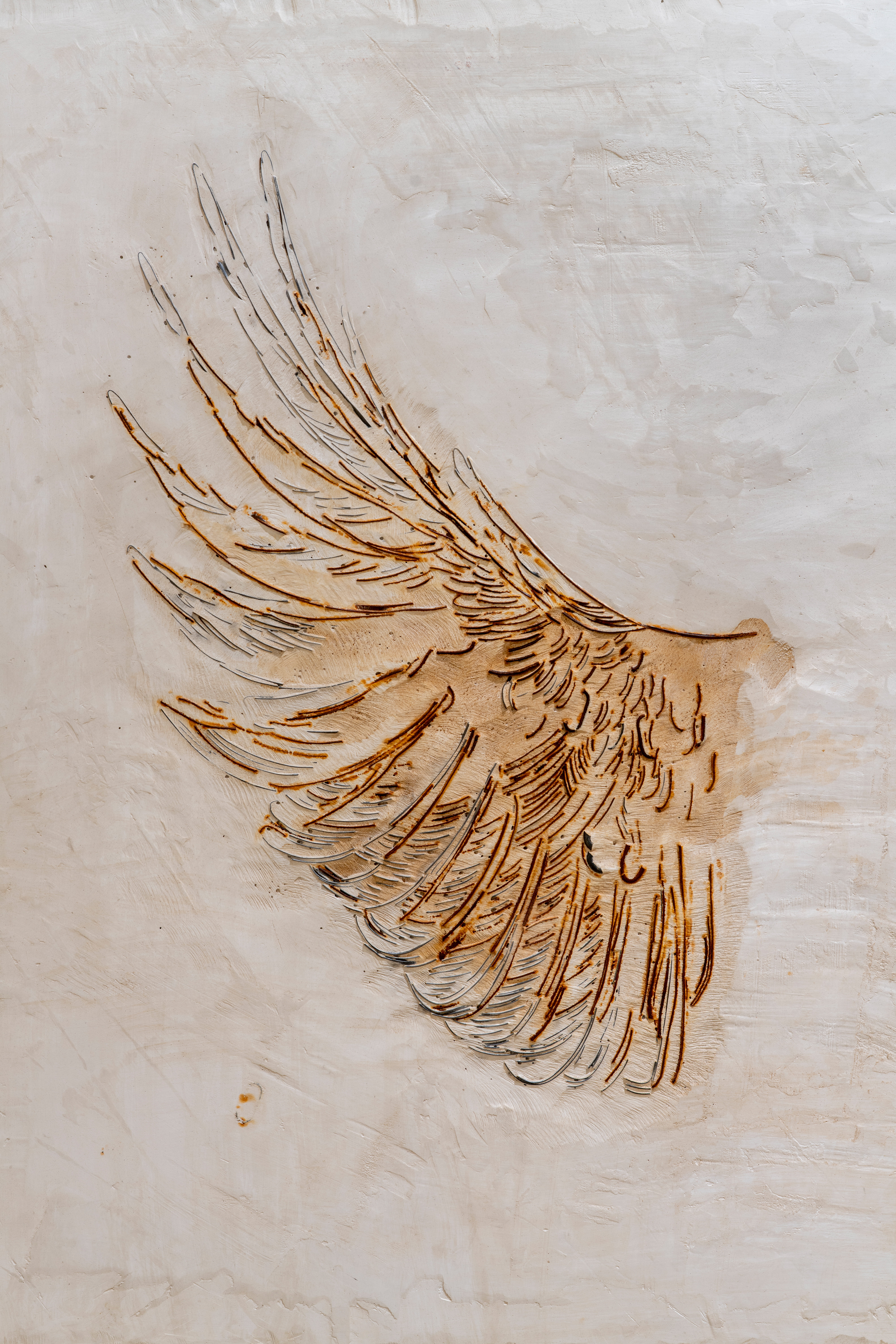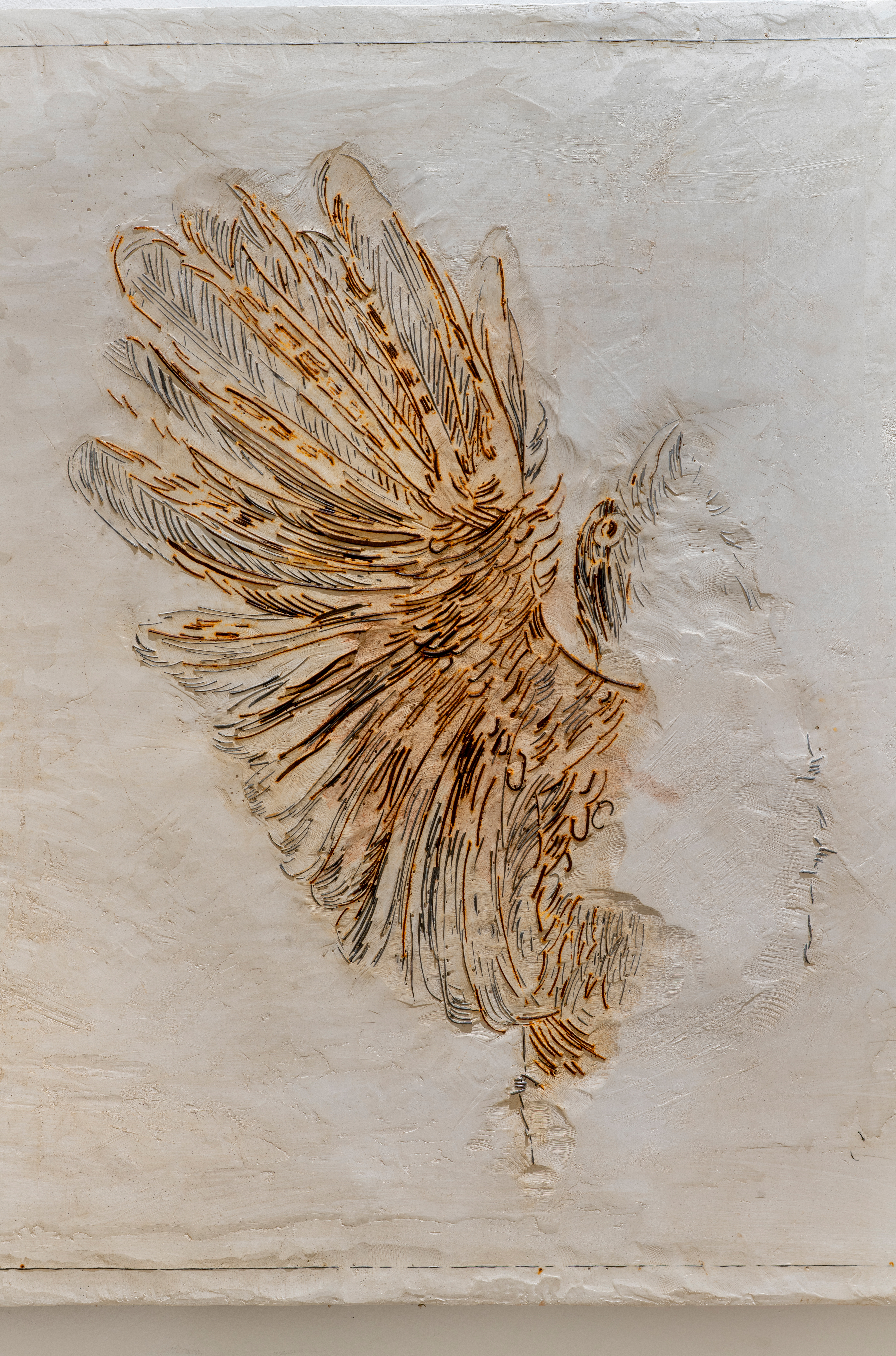 This bird, which dies if caged, has long been a symbol of Cubans’ love for freedom. Here, however, we do not see the complete animal but fragments of its wings, dissected, suspended in a rough, silent space. The wings are outlined with barbed wire, broken chains, and corroded metal: materials of confinement, of borders. This material tension speaks of the symbolic imprisonment not only of bodies but also of dreams of liberation.